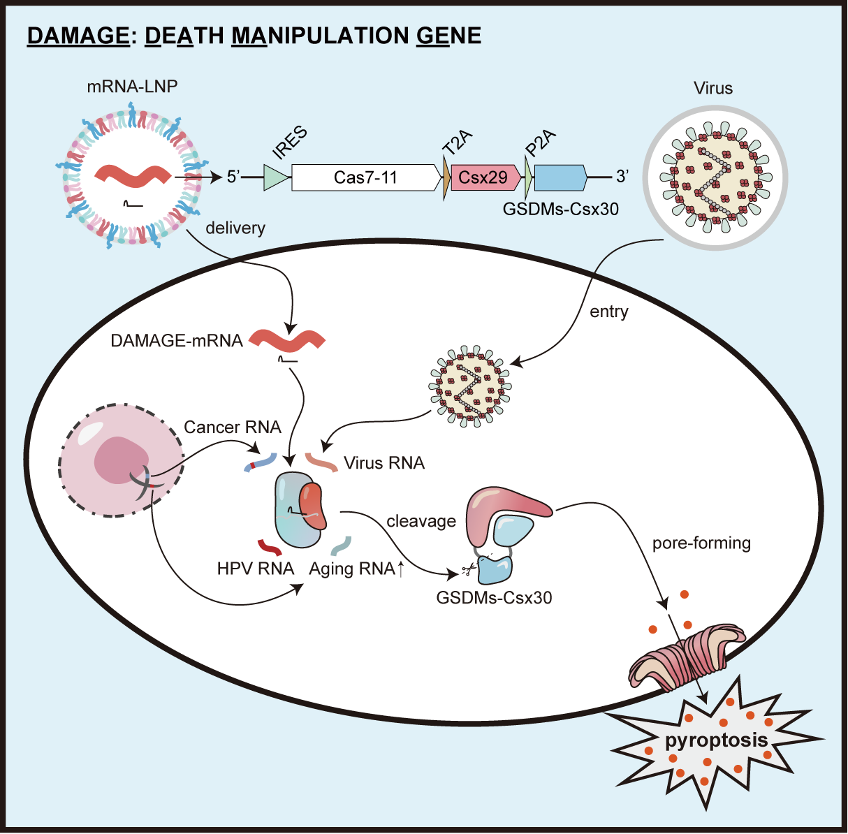 近日,湖北大学生命科学学院病毒学与疫苗研究中心陈明周教授团队在合成生物学领域取得重要研究进展,相关成果以 “A synthetic system for RNA-responsive pyroptosis based on type III-E CRISPR nuclease-protease”为题,发表于国际期刊《Nature Communications》。该工作利用合成生物学技术,成功构建了一种基于RNA响应的可编程细胞焦亡诱导系统——DAMAGE系统,为病毒感染、基因突变相关肿瘤及衰老相关疾病等“RNA异质性疾...