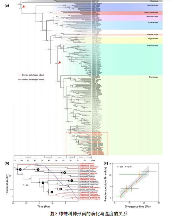 (a)园蛛科BEAST树。红色箭头表示化石校正节点,钟巢蛛种名标记为红色;(b)钟形巢分化时间与温度的卡方检验;(c)钟形巢的分化时间(绿色水平线段代表95%后验率)与全球变冷事件(橙色垂直线段代表全球冷却事件的起止时间)之间的线性回归和斯皮尔曼相关性。