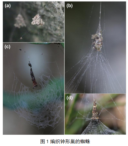 (a)钟巢钟蛛Campanicola campanulata;(b)大理拟肥腹蛛Parasteatoda daliensis;(c)筒腹便蛛Fecenia cylindrata;(d)Nemoscolus sp.。钟锐拍摄。