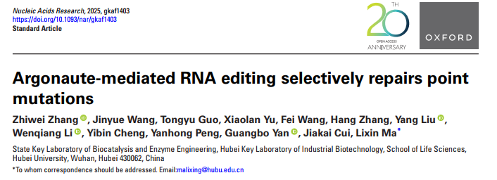 近日,湖北大学生命科学学院马立新教授团队在国际核酸研究领域顶级期刊《Nucleic Acids Research》(IF=13.1)在线发表题为“Argonaute-mediated RNA editing selectively repairs point mutations”的研究论文(图1)。该研究首次在哺乳动物细胞中实现了异源真核Argonaute蛋白质介导的RNA knockdown,并首次将Argonaute蛋白质应用于RNA编辑技术。结果表明,真核Argonaute蛋白质不仅可以用于RNA干扰,还能够用于RNA编辑。这一发现拓展了真核Argonaute蛋白质的研究范式,为RNA治疗提供了新策略。