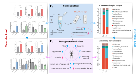 本研究以农田优势天敌草间钻头蛛Hylphantes graminicola为研究对象,系统评估了低致死浓度辛硫磷对其F0和F1两代生长发育、转录组、共生微生物的影响。研究发现,亲代暴露于LC30浓度辛硫磷后,虽然F0代雌蛛寿命显著缩短,但其繁殖力显著提升;F1代虽未直接接触农药,仍表现出类似的繁殖增强效应和发育延迟。转录组和RNAi功能验证表明,卵黄原蛋白(Vg)和细胞色素P450基因(CYP2J1)分别在繁殖调控和解毒代谢中发挥关键作用。此外,16S rRNA测序结果显示,辛硫磷暴露导致两代蜘蛛体内共生菌Wolbachia丰度下降、Cardinium丰度上升,表明微生物群落的改变可能与其繁殖适应性提升有关。该研究揭示了低浓度农药通过调节宿主基因表达和共生菌结构,诱导天敌蜘蛛产生跨代适应性响应,为优化IPM策略中农药使用及保护天敌种群提供了重要理论依据。