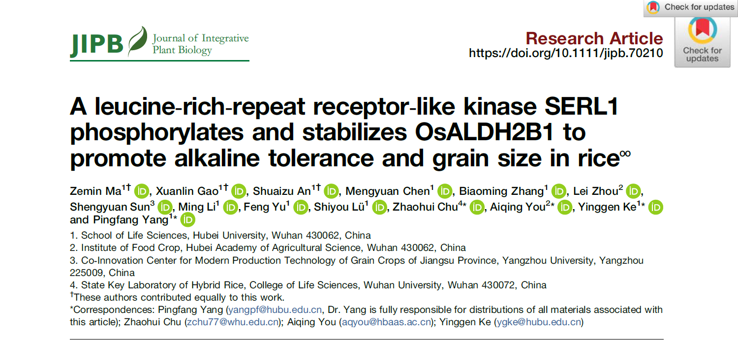 查看更多近日,JIPB在线发表了湖北大学生命科学学院杨平仿教授课题组题为“A leucine-rich-repeat receptor-like kinase SERL1 phosphorylates and stabilizes OsALDH2B1 to promote alkaline tolerance and grain size in rice”的研究论文,揭示了定位于质膜的LRR-RLK家族成员SERL1能够感知碱胁迫,并磷酸化醛脱氢酶OsALDH2B1的Thr-481位点,阻断其降解并增强稳定性。稳定后的OsALDH2B1通过抑制GS3促进H₂O₂外排,同时激活CatA增强H...