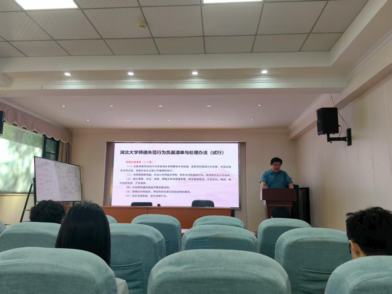 陆伟书记以“严明纪律规矩,筑牢师德防线”为主题,系统解读了《中国共产党纪律处分条例》《事业单位工作人员处分规定》《湖北大学教师师德失范行为负面清单及处理办法》《湖北大学教职工考勤管理暂行办法》等文件精神,重点结合学校实际,剖析了中国共产党纪律处分条例、湖北大学教师师德失范行为负面清单及处理办法、教职工考勤管理暂行办法中的关键条款。他强调,全体教职工要深刻认识中央八项规定是长期有效的铁规矩,必须常抓不懈、久久为功,通过身边事警醒身边人,以严明纪律规矩不断营造风清气正的政治生态;要严守政治纪律、组织纪律和廉洁纪律,将纪律要求转化为日常习惯和自觉遵循;要强化师德师风建设,坚决杜绝学术不端等失范行为,维护教师职业尊严。