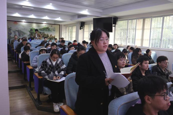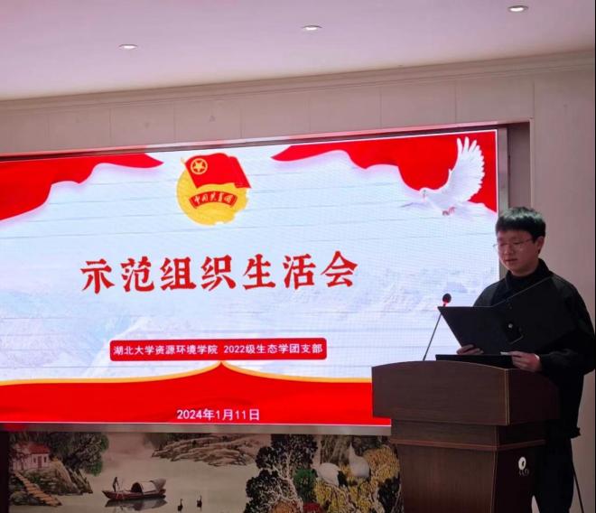 随后,团支部书记赖俊泽向全体与会领导、老师和团员青年做2023年度团支部团员和青年主题教育开展情况的工作汇报。2023年,在学校团委的统一领导和学院团委精心指导下,2022级生态学团支部围绕思想旗帜、坚强核心、强国复兴、挺膺担当等专题,采取多种学习形式,先后开展了“青春与祖国同行”“强国复兴担使命,实干奋进我先行”“挺膺担当肯奋斗,奋楫笃行向未来”等主题团日活动,团员和青年覆盖率、出勤率均达100%。