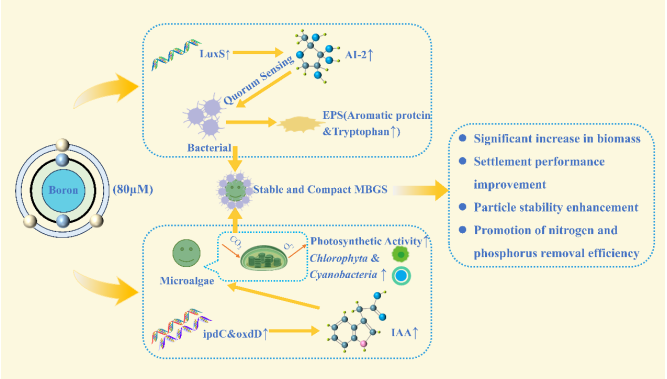 微藻-细菌颗粒污泥(MBGS)是一种高效、节能且环境友好的污水处理技术,能够通过微藻和细菌的协同作用实现污染物去除和资源化利用。然而,藻类与细菌之间的相互关系易受环境变化影响,导致系统稳定性下降。本研究聚焦硼元素在MBGS系统中的作用,发现硼通过促进细菌自诱导因子(AI-2)的分泌,激活群体感应(QS),显著提高细胞外聚合物(EPS)的生成量,增强了颗粒污泥的结构稳定性和沉降性能。同时,硼调控藻类吲哚-3-乙酸(IAA)的水平,提高光合作用效率,使绿藻门和蓝藻门的丰度显著增加,从而优化了氮、磷等污染物的去除效率。在最优硼浓度(80 µM)下,MBGS系统表现出最佳性能,包括显著提高的氨氮(NH4+-N)和磷酸盐(PO43--P)去除效率,以及降低的氧化应激水平(以超氧化物歧化酶(SOD)活性减少为标志)。硼通过调控藻类与细菌的信号通信,强化了它们的协同作用,为提升MBGS技术在污水处理中的稳定性和效率提供了理论依据。这一研究结果展现了MBGS技术在实现碳中和与资源回收方面的巨大潜力。本论文湖北大学为第一完成单位,湖北大学资源环境学院2021级硕士生万仁辉和2023级硕士生莫凡为共同第一作者,湖北大学资源环境学院胡惠秩副教授为论文通讯作者。该项研究得到湖北省自然科学基金的支持。