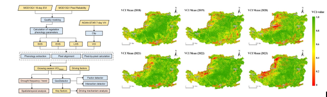 此项研究针对气候变暖背景下的黄土高原植被生长季干旱问题,采用植被状况指数(VCI)作为干旱指标,结合增强型植被指数(EVI)物候提取方法,分析了2018-2023年黄土高原植被生长季干旱的时空动态。并通过地理探测器方法,定量评估了气候、地形和人类活动等因素对植被生长季干旱的驱动效应。研究结果为理解黄土高原生长季干旱的时空格局及其驱动因素提供了科学依据。