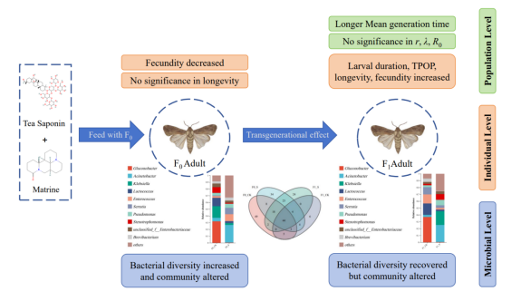 2024年3月29日,湖北大学资源环境学院朱洋博士在农林科学领域的Top期刊Industrial Crops & Products(中科院SCI一区,IF = 5.9)上发表了题为“Transgenerational effect of a tea saponin–matrine mixture promotes fecundity and alters associated bacteria in the fall armyworm Spodoptera frugiperda”的学术论文。