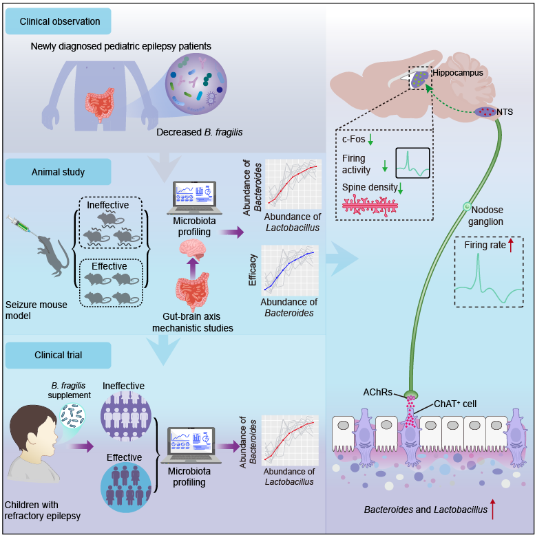 本研究实现了从临床观察到机制解析再回到临床验证的科学闭环:从临床癫痫患儿中发现脆弱拟杆菌减少,解析了特异菌株作用于迷走神经胆碱能环路的机制;在动物模型中揭示的菌群协同特征,随后在真实临床干预中得到印证。这不仅为益生菌治疗癫痫提供了理论基础,更在癫痫患儿中展现出明确的应用前景(图-1)。