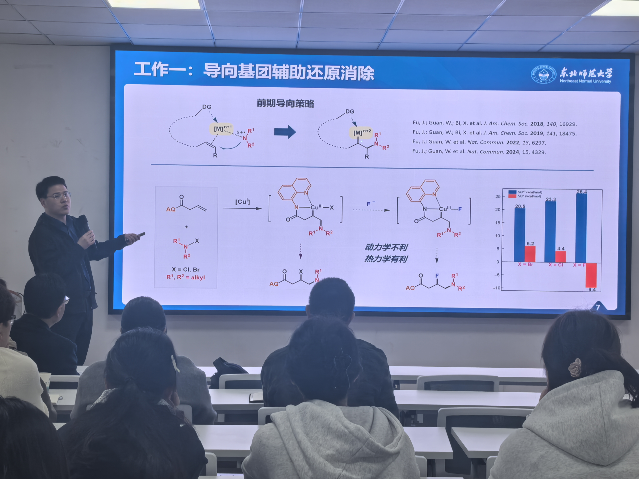 傅俊凯教授的报告题目为“烯烃胺氟化反应研究”,主要从导向基团辅助还原消除、简单烯烃富电子胺氟化反应、共轭双烯的富电子胺氟化反应、未保护邻氨基氟化物的合成等4个方面介绍烯烃胺氟化反应研究进展。报告会后,学院师生踊跃提问,积极向傅俊凯教授请教,现场气氛热烈。