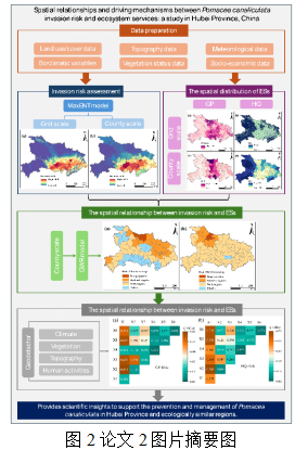 论文二2026年发表在《Ecological Frontiers》(原名《生态学报(英文)》),题为“Spatial relationships and driving mechanisms between Pomacea canaliculate invasion risk and ecosystem services: A study in Hubei Province, China”。研究表明了湖北省福寿螺入侵风险呈显著空间异质性,高风险主要集中于低海拔、水资源丰富的农田地区,并且总体上与粮食产量和生境质量等生态系统服务呈负相关,这一关系受气候、地形和植被等多因子交互驱动。在高风险区域,福寿螺的集聚分布会加剧其对生态系统服务的负面影响,但生态系统自身调节与管理措施可在一定程度上缓解这些影响。