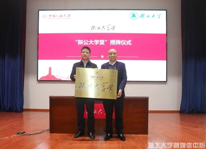 现场还举行中国人民大学“陕公大学堂”授牌仪式,向培凤为湖北大学授牌,校党委副书记侯勇上台接牌。据悉,“陕公大学堂”以中国人民大学的前身、诞生于抗日烽火中的“陕北公学”为名。毛泽东主席曾评价陕北公学,“中国不会亡,因为有陕公”。为赓续红色血脉,贯彻落实习近平总书记2022年4月考察中国人民大学时的重要讲话精神,中国人民大学于2023年10月创办“陕公大学堂”公益讲座,组织校内外知名专家学者“送课上门”,持续为各地输送优质学习资源,至今已举办100余场。