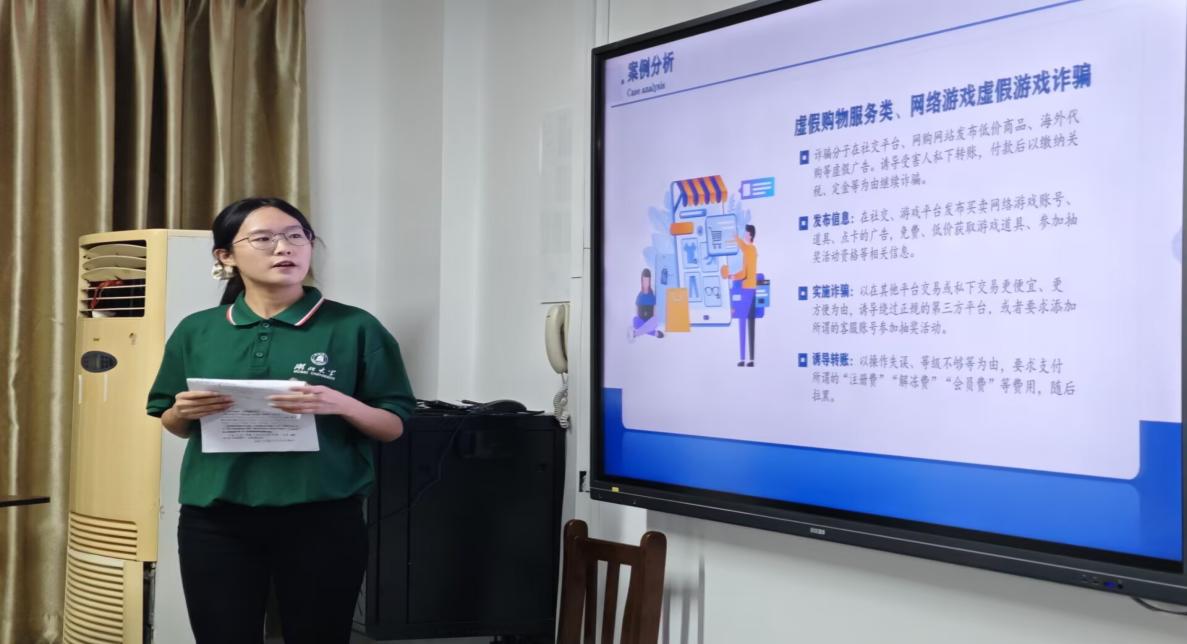 “据统计,截至2025年,全国共破获电信网络诈骗案件约173.9万起。其中,大学生群体约占13.38%。”宣讲人通过一组数据指出,大学生群体社会经验相对不足,但又具备一定的经济支配权,已成为诈骗分子重点围猎的目标。真实的案例与触目惊心的损失金额,让在场的每一位同学都深刻意识到,诈骗并非远在天边的新闻,而是随时可能发生在自己身边的威胁。随后,宣讲人系统解析了兼职刷单、网络交友、虚假购物等高发诈骗类型,并通过案例视频强化认知。