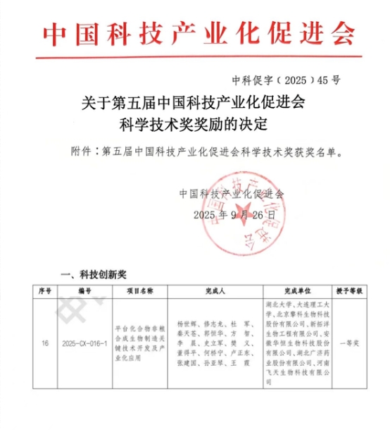 中国科技产业化促进会科学技术奖是经国家科学技术奖励工作办公室批准设立,面向全国的社会科技奖项,旨在表彰在科技创新和产业化领域做出突出贡献的个人和团队。“平台化合物非粮合成生物制造关键技术开发及产业化应用”项目由湖北大学联合大连理工大学、北京擎科生物科技股份有限公司等企业协同攻关,利用合成生物学技术,创立了一站式工业菌株数据分析平台与数据库,研发了具有自主知识产权的生物元件预测与鉴定、高效基因组编辑等技术,构建了非粮乙醇、D-乳酸、1,3-丙二醇等高产稳产工业菌株,实现了利用非粮原料高效生产多种平台化合物的产业化应用。项目对推动我国生物制造产业升级,保障粮食安全和实现“双碳”目标具有重要意义。