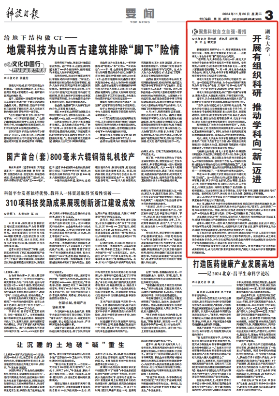 11月26日,《科技日报》要闻版《聚焦科技自立自强·看招》栏目,以“开展有组织科研 推动学科向‘新’迈进”为题,报道湖北大学生物学科发展。原文如下: