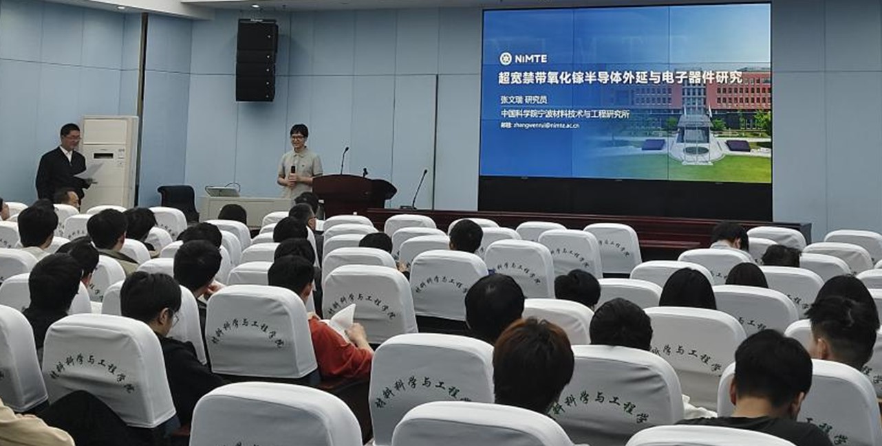 报告会中,张文瑞研究员首先简要概述了其团队在半导体薄膜外延生长、半导体载流子输运机理及宽禁带氧化物半导体电子器件三个方面的研究进展情况。接着,张文瑞研究员重点报告了其团队在新型超宽禁带半导体---氧化镓材料与器件领域的主要研究成果。一方面,通过协同调控生长工艺、衬底取向与微量掺杂,实现了氧化镓晶相的有效调控和高质量薄膜外延生长;基于高质量外延薄膜,研究氧化镓的掺杂机理和电导调控行为,实现了薄膜电导宽范围调控,并将其应用于高性能氧化镓功率二极管的设计与制备。最后,研究了氧化镓薄膜的缺陷分布特性对光生载流子输运的影响,发展了调控载流子空间分布与定向迁移的有效方法,提出了制备高性能深紫外光电探测器的设计思路。张文瑞研究员的报告深入浅出,引起参会师生的热烈反响;交流环节中,与会师生踊跃提问,张文瑞研究员耐心解答师生们的疑问,报告会在浓郁的学术氛围与热烈的掌声中圆满结束。